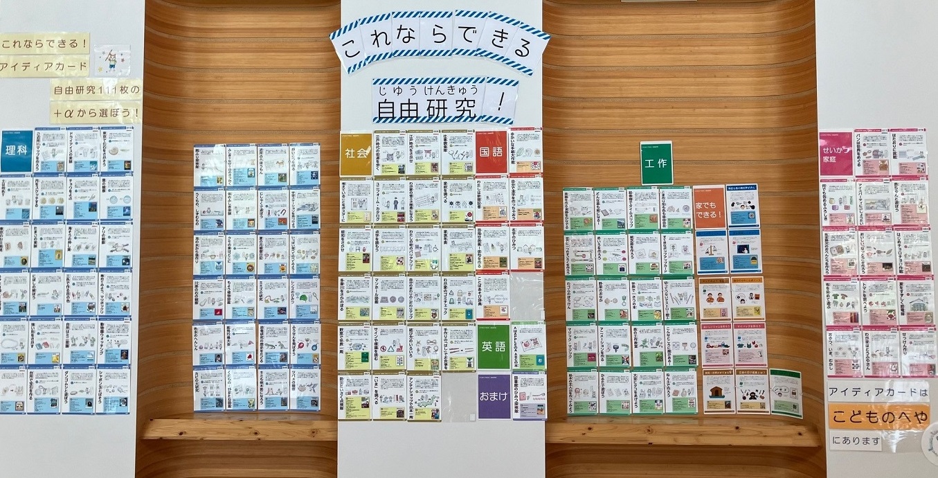 夏休み、「こどものへや」は自由研究のヒントがいっぱい!理科、社会、国語、英語、せいかつ・家庭、工作、それから、家でできる研究…合わせて121 枚のアイディアカードや関連図書を展示しています。