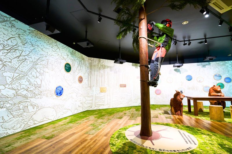 また、水道水源林の世界を体験できる展示室では、緑を守るための仕事について知ることができます。健康な森をつくるための、木から余分な枝を切り落とす「枝打」や、暗くなっているところでは木を切って本数を減らす「間伐」という作業が立体模型で展示されています。また、水道水源林をバーチャルで散策するゲームを通して森のスケールを感じることもできます。