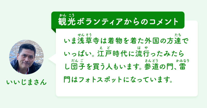 江戸時代を感じられる代表的な場所の一つは浅草。「雷門」でよく知られる「浅草寺」を中心として、いろいろな楽しいものが集まっています。