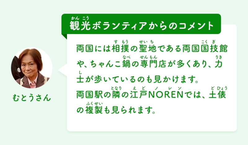 大相撲の本場所は1年に6回行われますが、そのうち3回は、この両国国技館で開催されます。まちを歩くと、力士と出会えるかもしれません。両国駅の旧駅舎にある「-両国-江戸NOREN」では、多様な食を楽しむことができます。