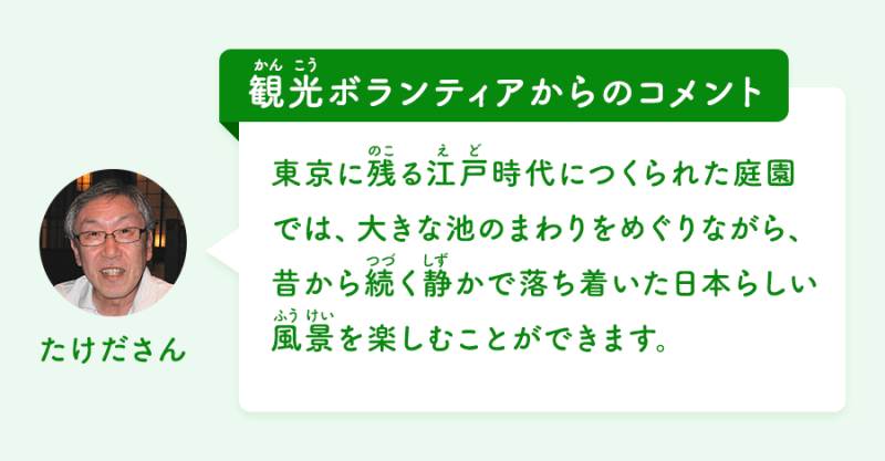 東京にはたくさんの日本庭園があり、なかでも都立庭園の「旧芝離宮恩賜庭園」と「浜離宮恩賜庭園」は、どちらも江戸時代につくられた代表的な日本庭園です。明治時代につくられた「清澄庭園」もふくめ、どの庭園も自然がいっぱいです。