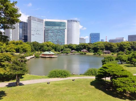 浜離宮恩賜庭園は、東京湾の海水による池や、水上に浮かぶように立つ茶屋が見どころで、まわりを囲むように立っている高層ビルとの違いをくらべてみるのもおもしろいですね。